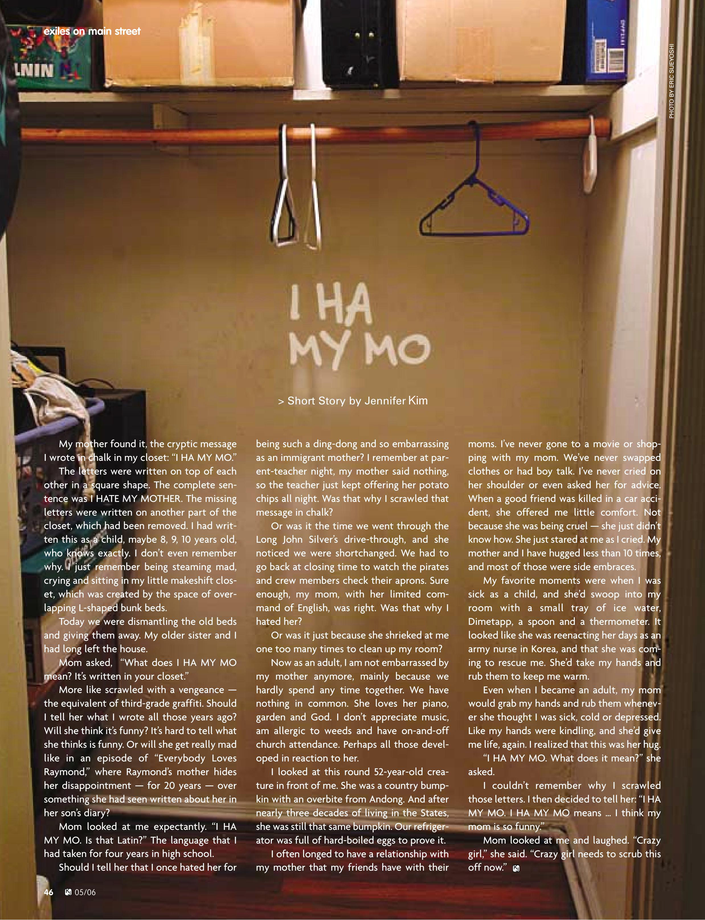 Sissyphus and Me (short story) Disorient Journalize; reprinted in Writing Away Here, a Korean/American anthology)