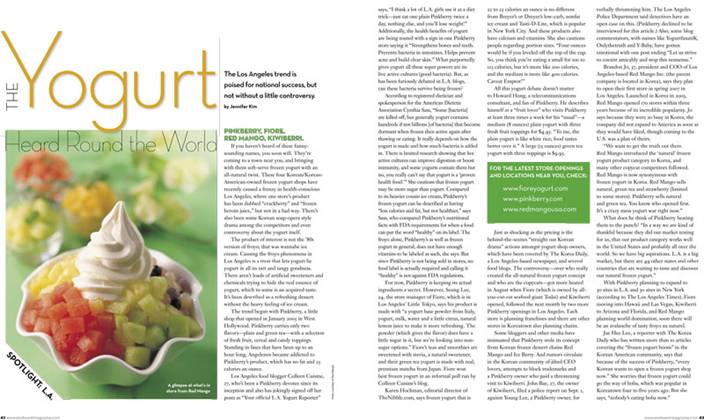 Some bloggers and other media have insinuated that Pinkberry stole its concept from Korean frozen dessert chains Red Mango and Ice Berry. And rumors circulate in the Korean community of jilted CEO lovers, attempts to block trademarks and a Pinkberry owner who paid a threatening visit to Kiwiberri. John Bae, 27, the owner of Kiwiberri, filed a police report on Sept. 1, against Young Lee, a Pinkberry owner, for verbally threatening him. The Los Angeles Police Department said detectives have an open case on this. (Pinkberry declined to be interviewed for this article.) Also, some blog commentators, with names like YogurtfanatiK, Onlythetruth and Y-Baby, have gotten emotional with one post ending “Let us strive to coexist amicably and stop this nonsense.”
